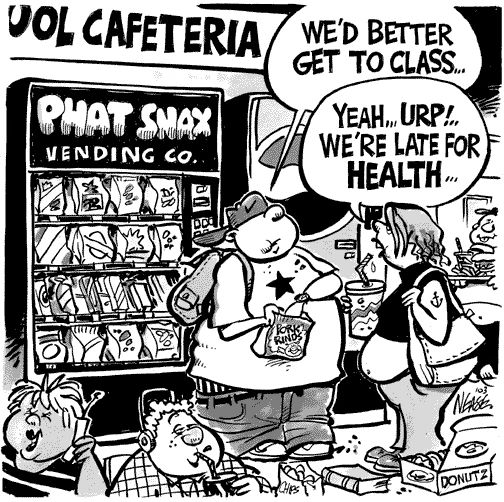 The surroundings someone is in has a large influence on their food choices. The Obesity Prevention Source claims, "In the U.S. and many parts of the world, the so-called food environment-the physical and social surroundings that influence what we eat-makes it far too hard to choose healthy foods..." the characters in the comic support the statement by being shown eating foods that aren't the most beneficial their health. A character in the drawing states, " Yeah... Urp! We're late for health..." despite being aware of the foods she and her friend are eating they will continue to make the same decision repeatedly because they choose to be oblivious to the consequences.